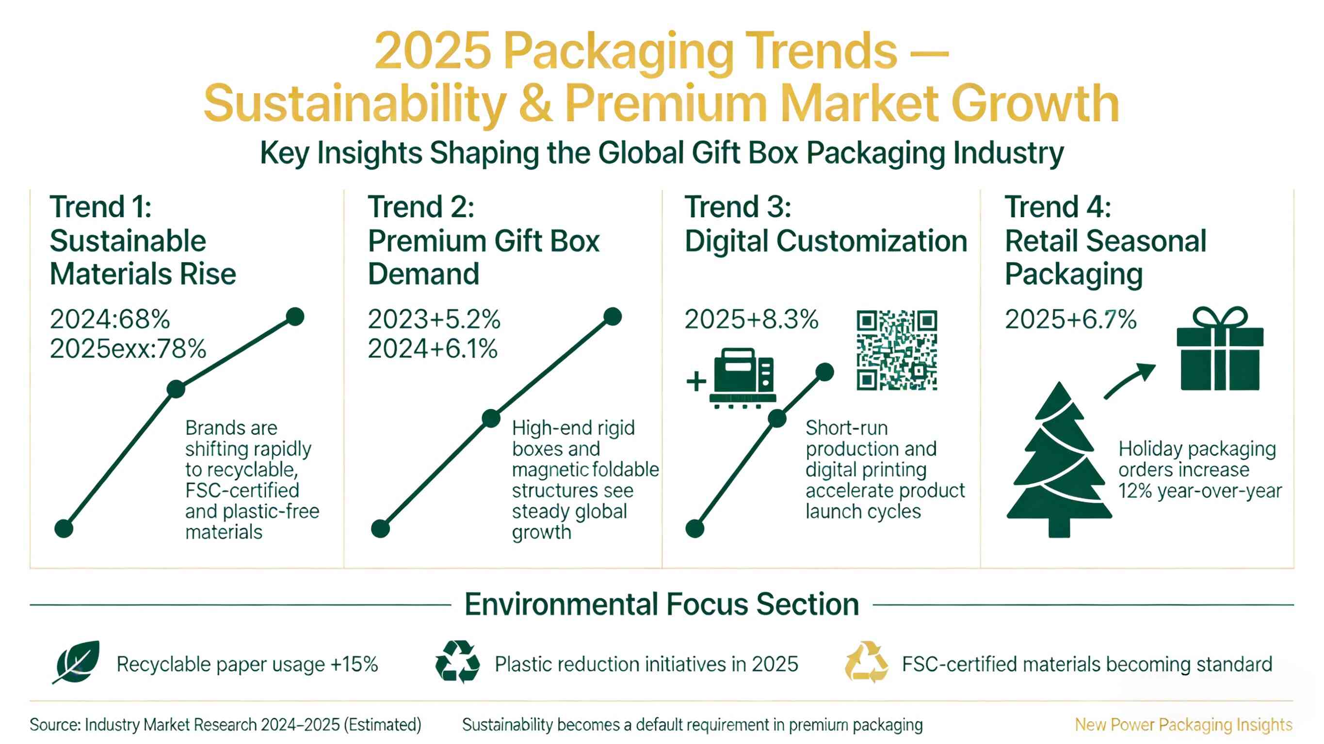 Market research forecasts:The premium gift box market will maintain growth of 6%–9% in 2025The sustainable packaging segment will grow by over 12%Digital printing and short‑run custom orders will see the fastest expansionLooking ahead, the packaging industry in 2025 will reflect a clearer direction: sustainability as the foundation, visual appeal as the highlight, and speed as the competitive edge.